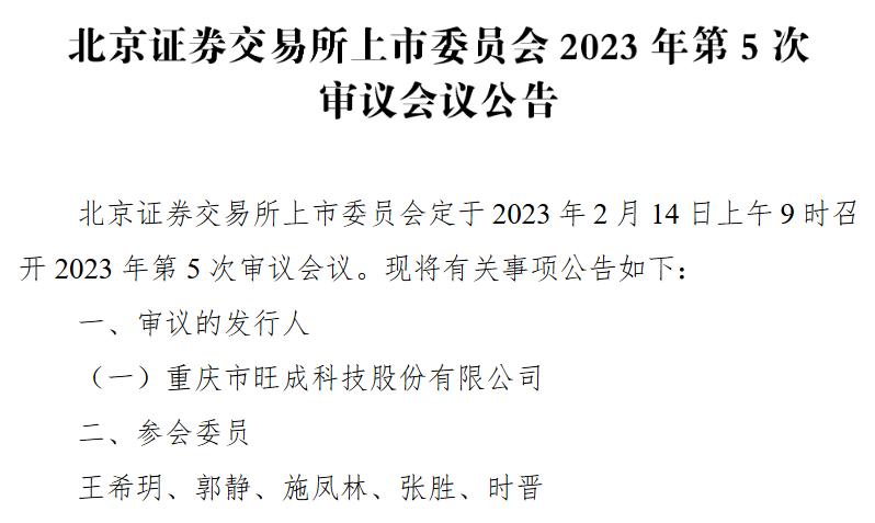 挖贝网 2月7日,北交所上市委定于2月14日召开2023年第5次审议会议,旺成科技(830896)上会,参会委员王希玥、郭静、施凤林、张胜、时晋。