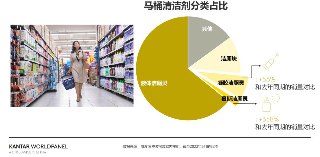 从购买数据来看,快速增长的不是传统液体洁厕灵,而是形式新颖的产品,例如占比虽小但增速很快的马桶慕斯清洁剂,以及不断在外包装上创新的凝胶类马桶清洁产品,这两类产品的增长均得益于渗透率的增长。