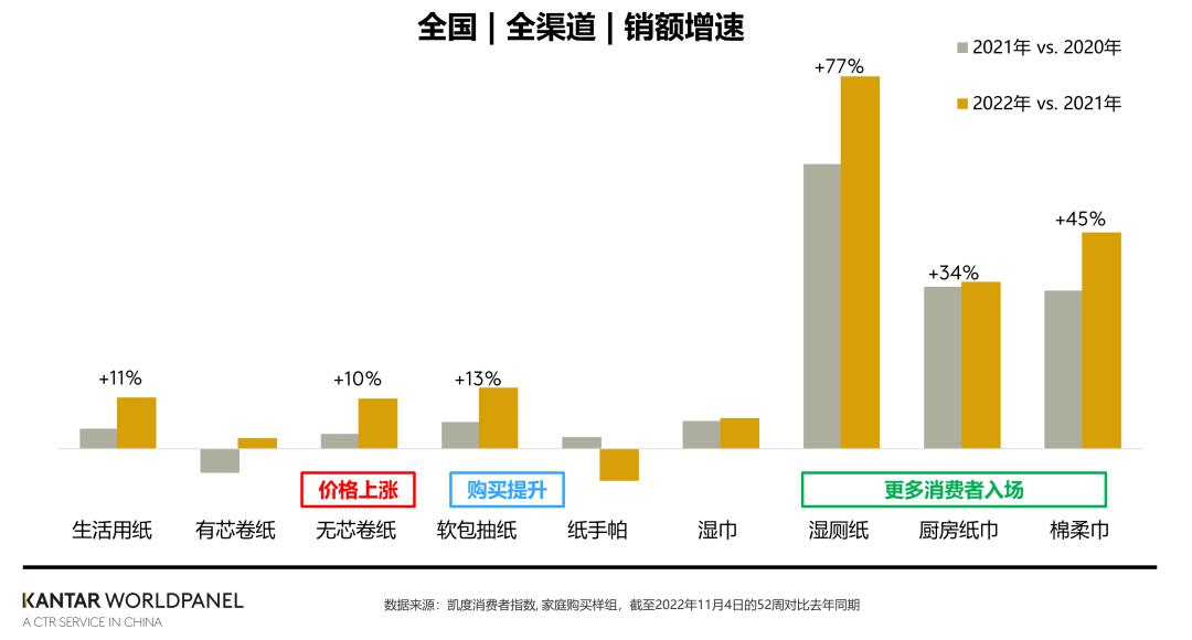 2022年的生活用纸销售额较2021年有明显提升,其中消费者常用的无芯卷纸与软包装抽纸分别取得了10%与13%的销额增长。 无芯卷纸的增长得益于品类整体价格上涨,而软包装抽纸的增长主要由消费者需求提升所驱动。