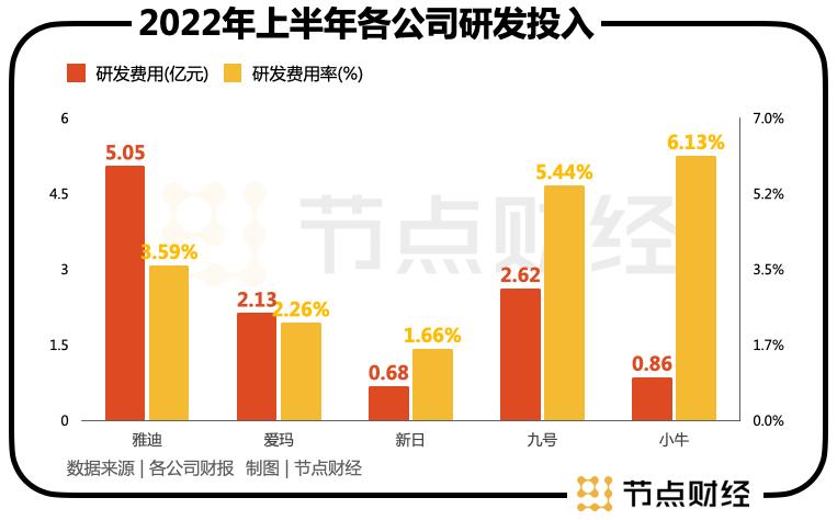 财报显示,2022年上半年,雅迪、爱玛、新日、九号、小牛分别支出研发费用5.05亿元、2.13亿元、0.68亿元、2.62亿元、0.86亿元,对应研发费用率为3.59%、2.26%、1.66%、5.44%、6.13%,付出和收获基本呈正比。