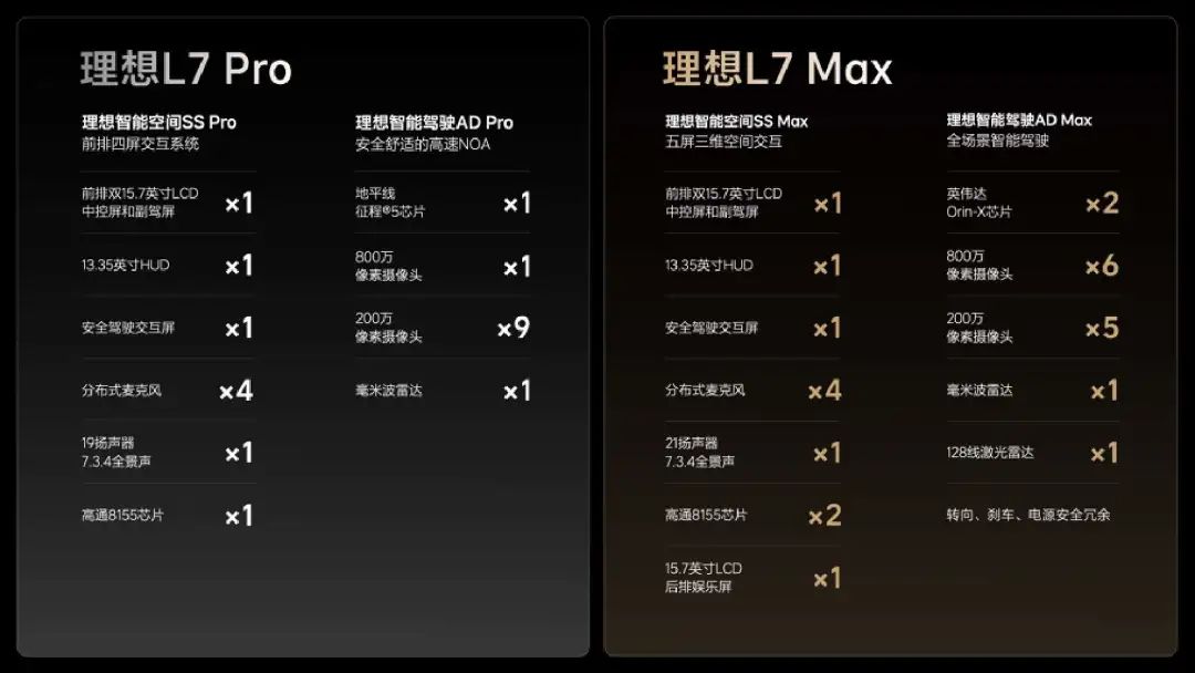理想L7 AD MAX的智能驾驶算力平台,使用了两颗英伟达Orin-X芯片作为处理器,总算力508Tops。搭配激光雷达以及全套自动驾驶安全冗余系统,将实现全场景的智能驾驶功能。