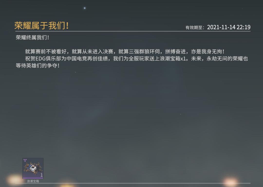 此后在2021年英雄联盟全球总决赛决赛当天,《永劫无间》官方一连发布五条微博为EDG加油助威,更在EDG夺冠后为每一位永劫无间玩家发放了奖励宝箱。
