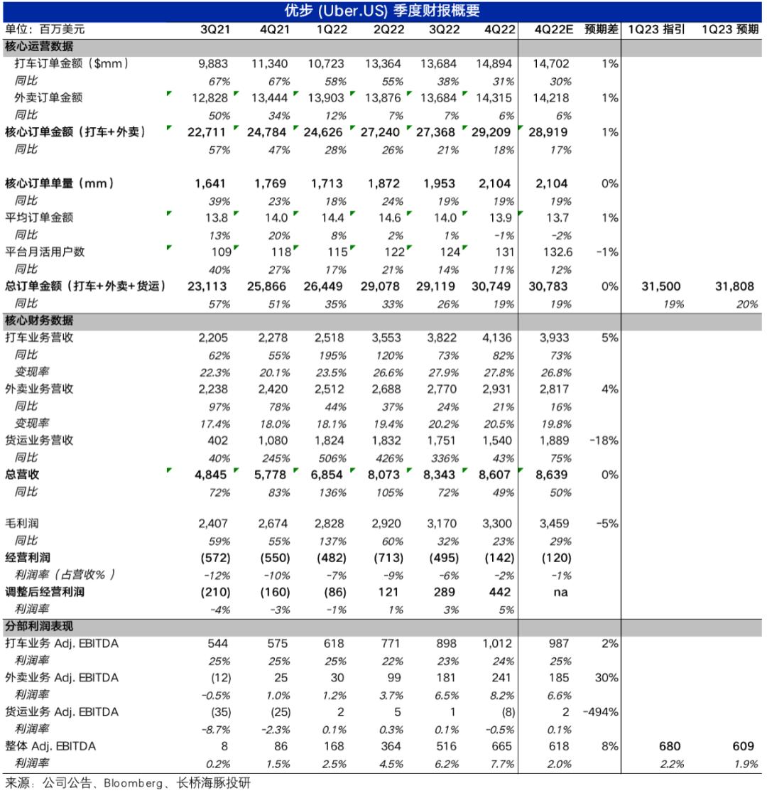 2.营收平平,但利润超预期:整体业绩上,Uber本季度总营收86亿美元,与市场预期完全一致。但由于国际货运需求降低,公司货运板块营收低于预期18%,市场真正关心的打车和外卖业务的营收实际还是市场预期约4%~5%的。利润层面,市场主要跟踪的调整后EBITDA利润(加回股权激励和一些计提的费用准备)本季为6.7亿美元,超出了市场预期的6.2亿和公司指引6-6.3亿的上限。而公司指引一季度的中值为6.8亿,同样远超市场预期的6亿。