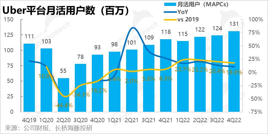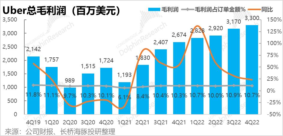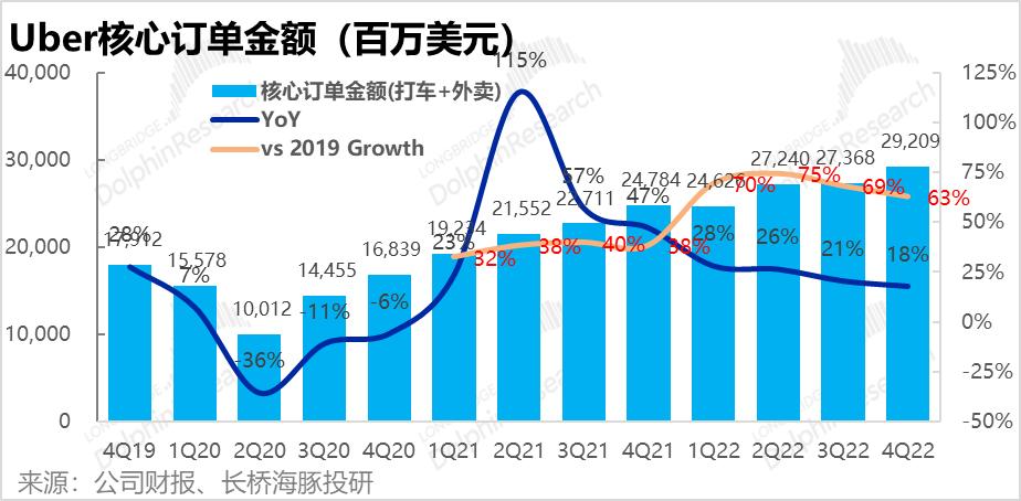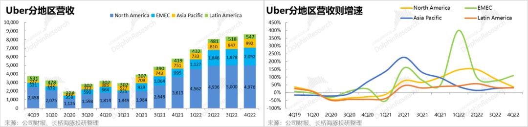 由于Uber在英国和加拿大等地区的商业模式从平台型转变为自营模式,公司确认的部分营收从净佣金变为总付款金额,导致营收被有所放大,因此下文海豚君主要从剔除会计变更影响后的表现。