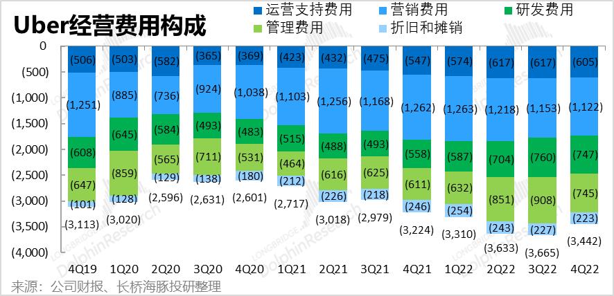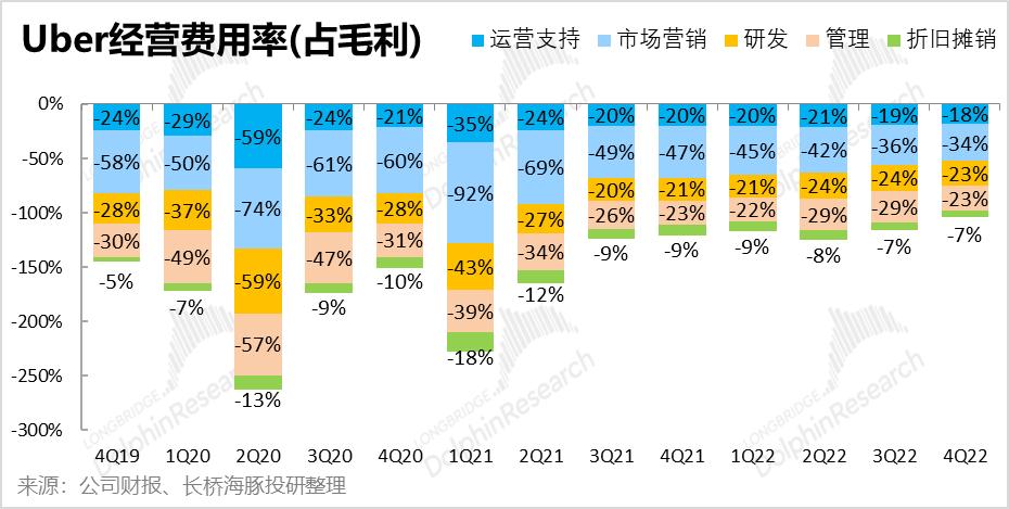 究其原因,与亚马逊、微软、谷歌等大公司在疫情期间过度扩张不同,海豚君覆盖的垂类小巨头(包括Uber和Airbnb),都在疫情期间大幅精简了人员来减轻成本压力。从下表可见,在公司营收和毛利都在双位数增长时,Uber的各项运营费用反而都在环比减少,总经营费用有上季度的36.6亿减少到本季的34.4亿。其中管理费用的下降幅度最大,占毛利润的费用率从29%直接下降到23%。可见公司对内部费用有显著压缩。