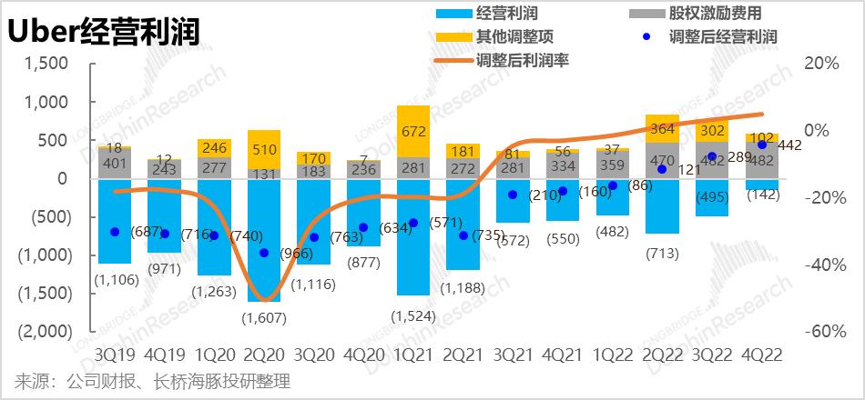 若剔除约4.8亿的股权激励费用,和法律、税收、监管等计提费用。Non-GAAP口径下,Uber本季已实现了4.4亿的经营利润,利润率持续改善。