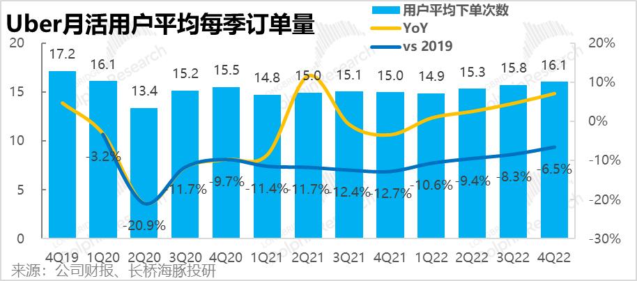 而从用户数量和下单频率的角度拆分,这两个因素也都在稳步提升。其中,Uber平台上使用过打车或外卖业务的月活用户达到了1.3亿人,相比2019年同期增长了18%。而本季度人均下单次数则为16.1次,距离2019年同期的频率仍低6.5%,但差距在逐季度缩窄。