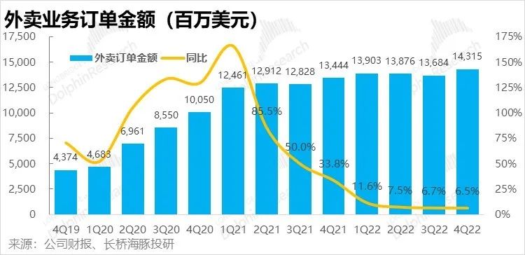 与变现率持续走低的打车业务不同,外卖业务在经历了疫情间的快速起量后,目前已进入了提升商业变现的阶段。本季外卖业务确认营收27.7亿美元,同比增长24%了。剔除模式变更的影响后,可比营收为29.3亿,略高于市场预期的28亿。剔除模式影响后,同比增速仍达20%,显著高于外卖订单额仅个位数的增长。实际变现率已达15.7%,环比上季度继续提升了0.4pct。