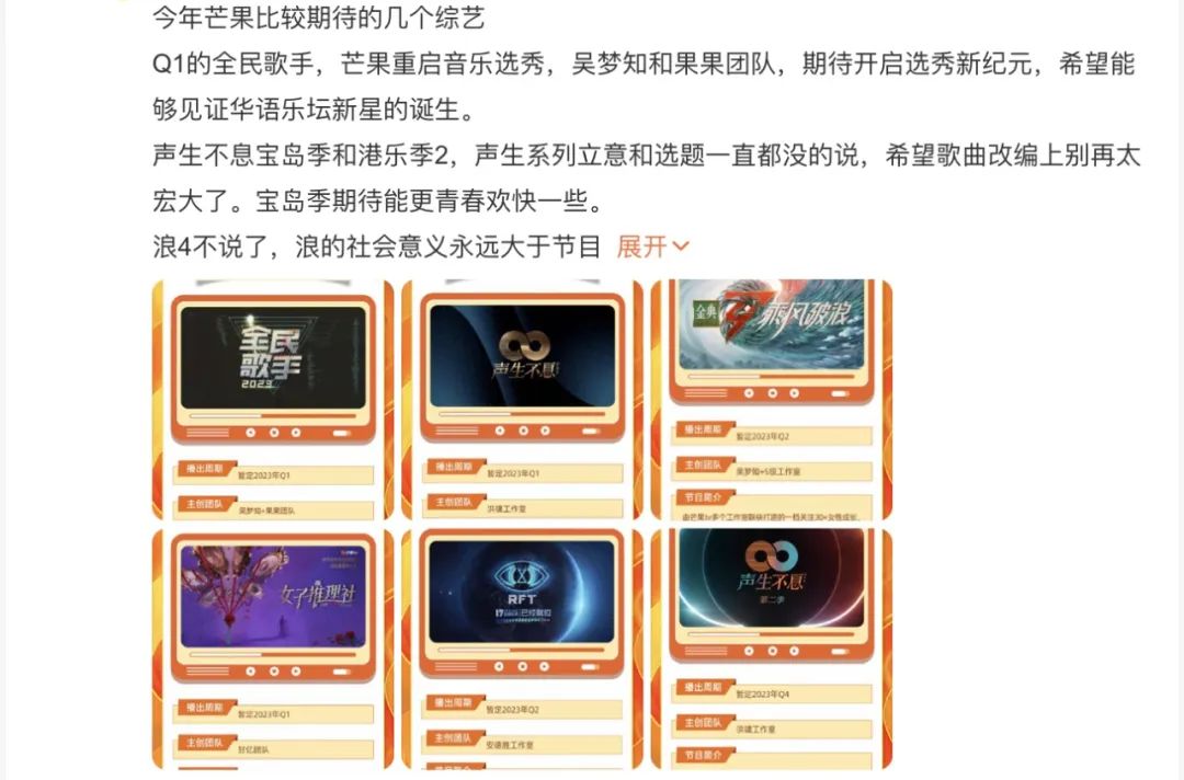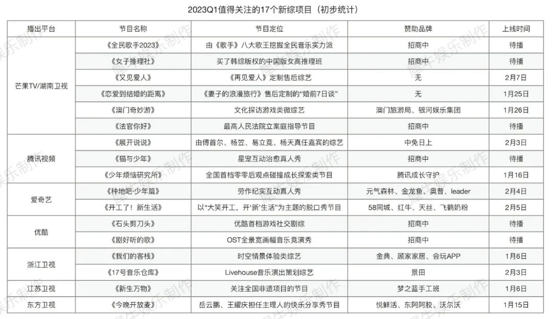 不同于去年Q1行业笼罩在项目停摆、招商遇冷的乌云密布中,今年Q1我们迎来的是一个各方面都在逐渐复苏中的综艺市场,很期待2023行业还会书写怎样的“新故事”。