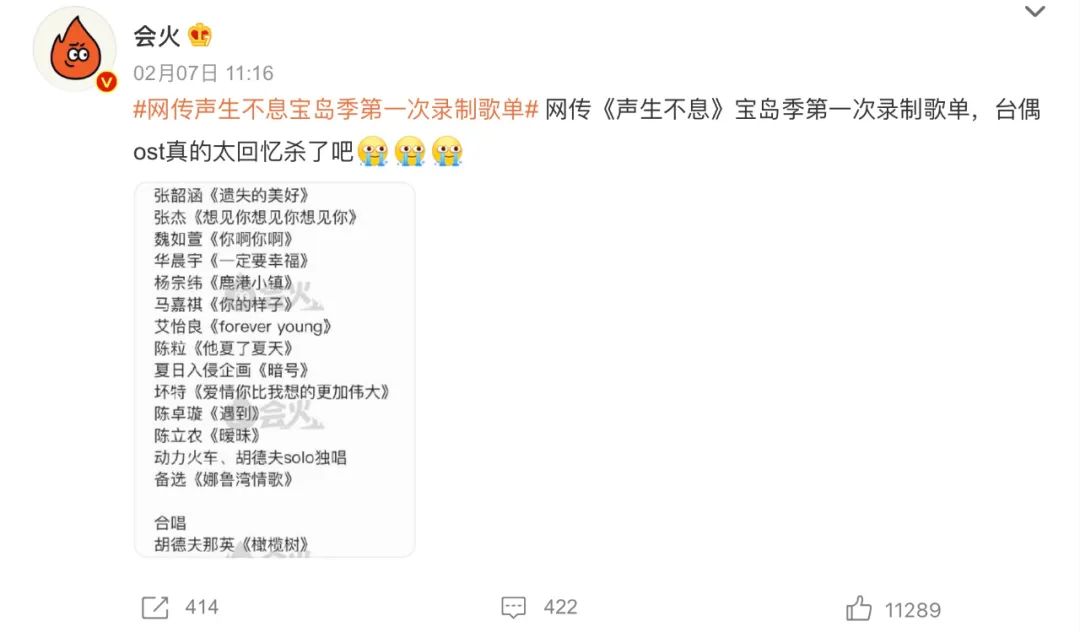 待播的《声生不息·宝岛季》在社媒的讨论度长期居高不下,主要因为节目在卡司阵容、曲目选择、情怀话题等方面都有了相比前季的一个飞跃,中国台湾流行音乐之于大陆听众的普及度比粤语歌更甚,网传歌单里的那英《白天不懂夜的黑》、马嘉祺《你的样子》等都有再翻红的潜质。