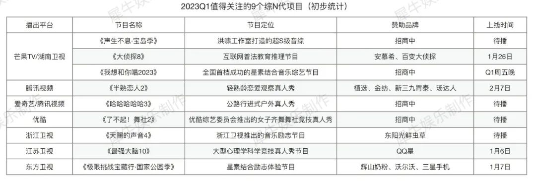 据犀牛君初步统计,目前台网各平台出品的Q1已播/待播的26档重点综艺项目里,有多达17档都是从零企划的新综项目(第一季),这显示出各平台在2023“重新出发”的内容决心。