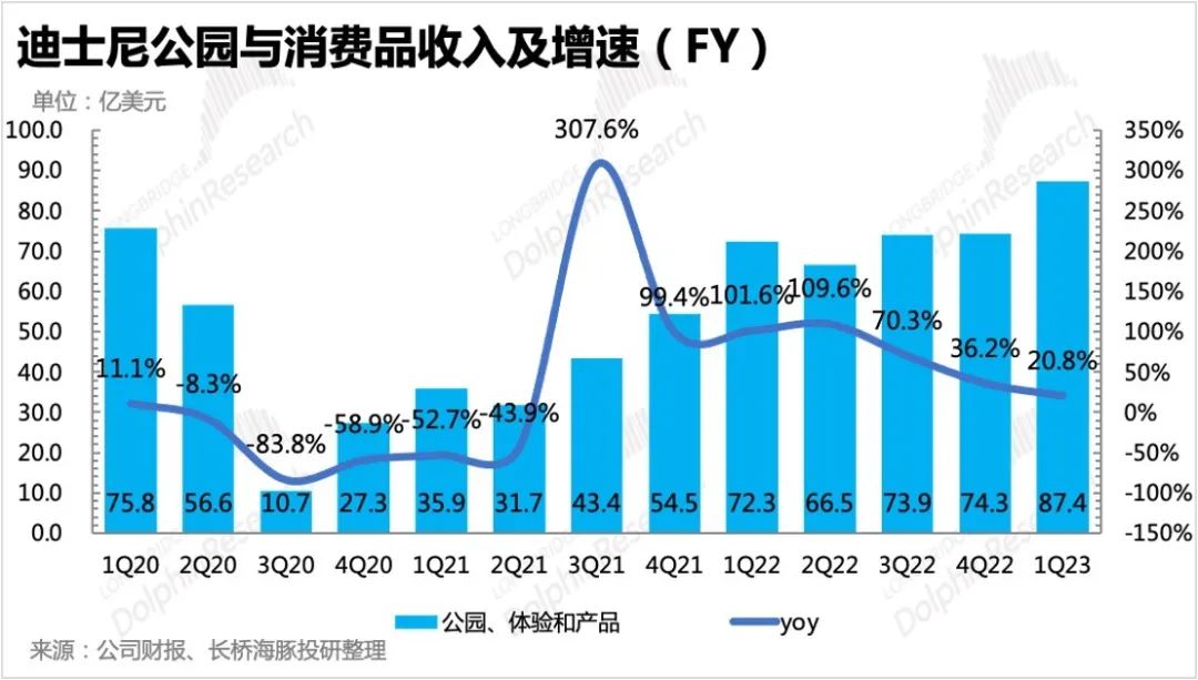 本季度主题公园与消费品合计收入87.4亿美元,同比增长21%,高技术下增长稳健,背后反映的是持续一年的需求仍然强劲。其中乐园体验收入72亿,同比增速27%,消费品收入同比持平。