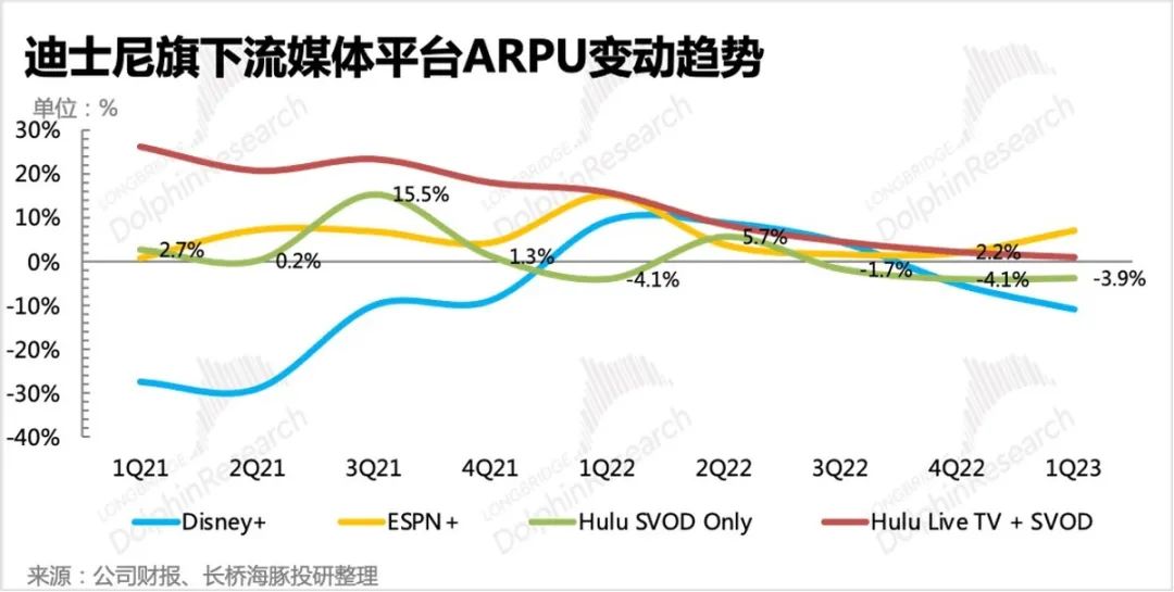 但在ARPU上,ESPN、Hulu环比走高都与涨价相关。Disney+虽然12月也进行了涨价,但对当季的影响不大,再加上低价广告服务的推出,ARPU环比略有下降。