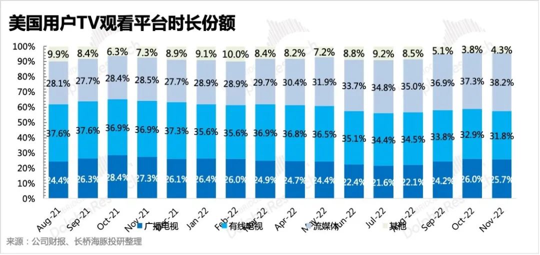 传统广播电视媒体本季度继续同比下滑5%,当季体育内容较少,且用户观影时长仍然保持从有线电视向流媒体迁移的趋势,因此会显著影响有线电视的广告收入。这不仅仅这两季会遇到的问题,而是一个中长期的趋势。