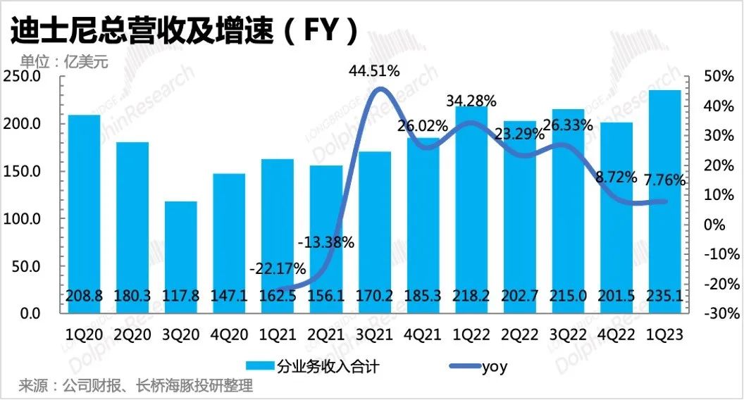 本季度迪士尼实现总营收235亿美元,同比增长7.8%。虽然增速环比来看未有改善,也在个位数水平,但更多的是源于同期高基数压力。