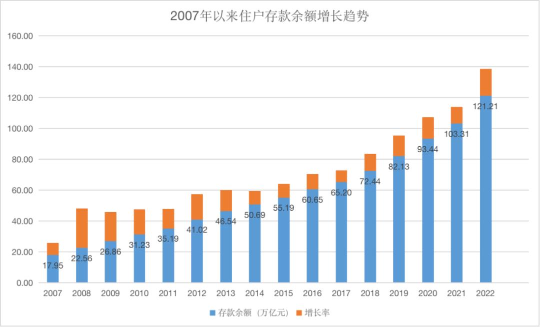 央行数据显示,2022年我国住户本外币存款同比增长近18万亿元,与前三年每年增长约10万亿元相比,多增加了约8万亿元。