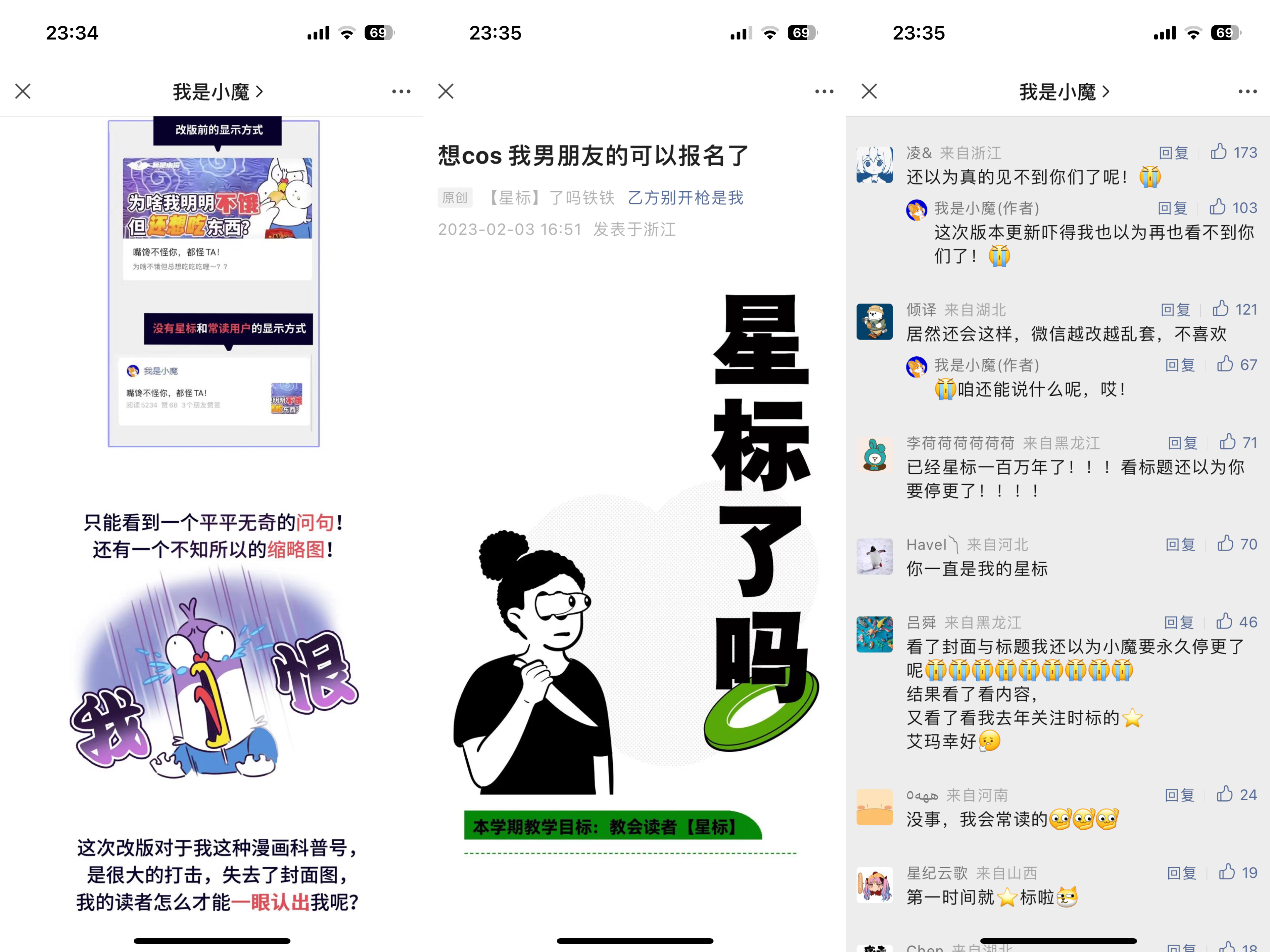 对于主要更新漫画、插图的号来说,这种打击更加严重。本周,许多以更新图片为主的公众号都以较吸引眼球的标题发文,如“最后一次见面”、“再也见不到我了”等等,提醒读者给自己的号加“星标”。文字公众号则多在文末添加醒目指引,也是为了同样的目的。