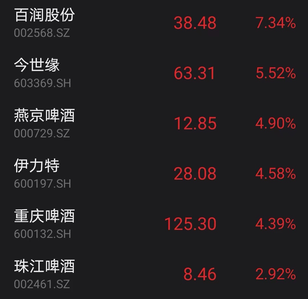 酿酒板块再度走强,百润股份涨近7%,今世缘、燕京啤酒、重庆啤酒、伊力特、泸州老窖、迎驾贡酒等纷纷拉升。