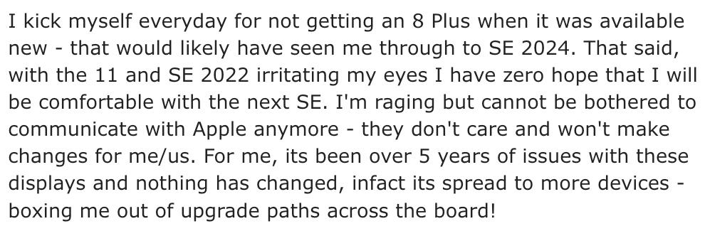 ——这名网友很后悔没有在iPhone 8 Plus(被市场誉为苹果最后一代顶级LCD屏手机)还在供应时买下它,他即便在用LCD屏幕的iPhone SE 2022时也感到眼睛不适,并不再期待第四代SE。