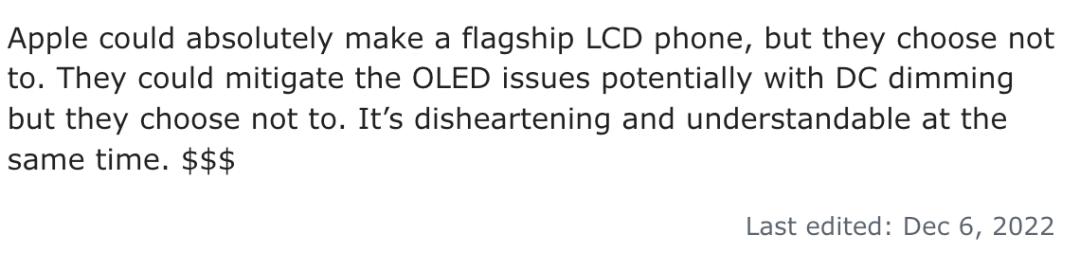 ——这名网友说,苹果绝对可以生产出一部旗舰级的LCD屏幕手机,但是它没有……