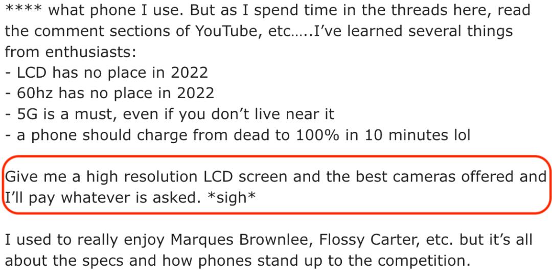 ——这名网友说,给我一个高分辨率的LCD屏幕,并配上最好的相机,我愿意付任何价格,唉。他后面补充说,非常喜欢Marques Brownlee(YouTube上测评苹果的知名黑人博主)等人,但这些内容全是关于性能测试和苹果竞争力的。