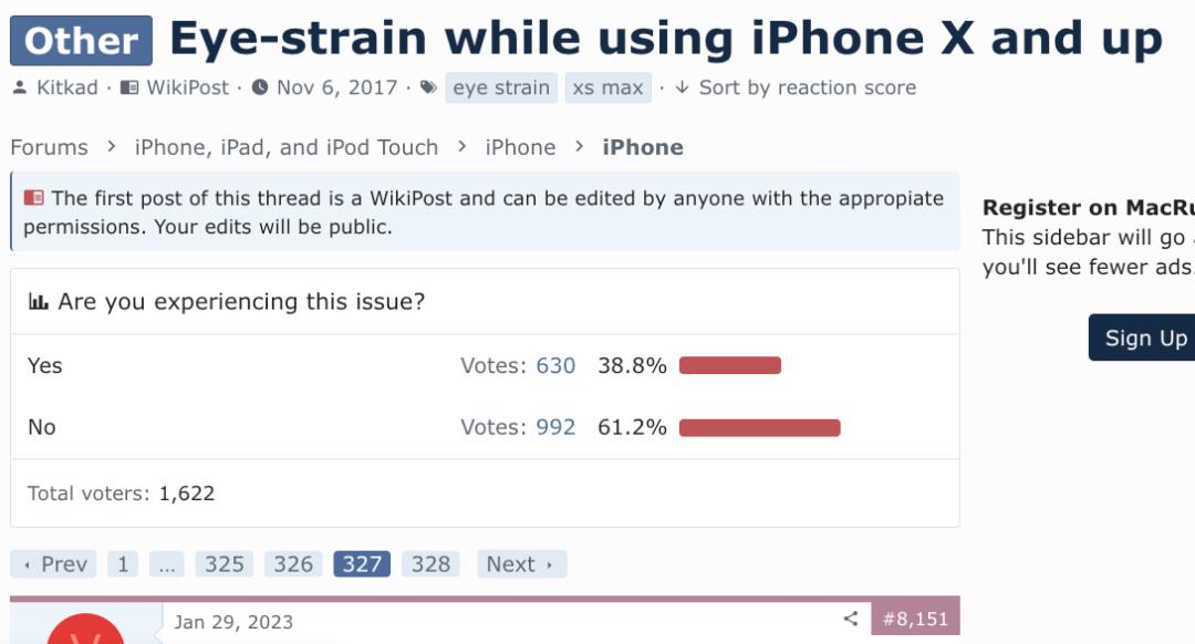 苹果最新一期财报发布时,我正在MacRumors论坛上一页一页地翻看一个帖子。标题是Eye-strain while using iPhone X and up,即“在使用iPhone X及更高版本机型时的眼睛压力问题”。该帖从2017年11月份创建,至今足足有300多页,共计8000多楼,且仍在持续更新。类似地,百度也有一个名为“关注屏幕健康”的贴吧。