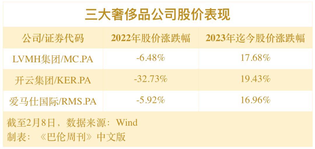 截至2月8日,三家法国顶级奢侈品公司——LVMH集团(MC.PA)、开云集团(KER.PA)和爱马仕国际(RMS.PA)均录得了15%以上的股价涨幅。而2022年,三家公司分别经历了不同程度的回调。