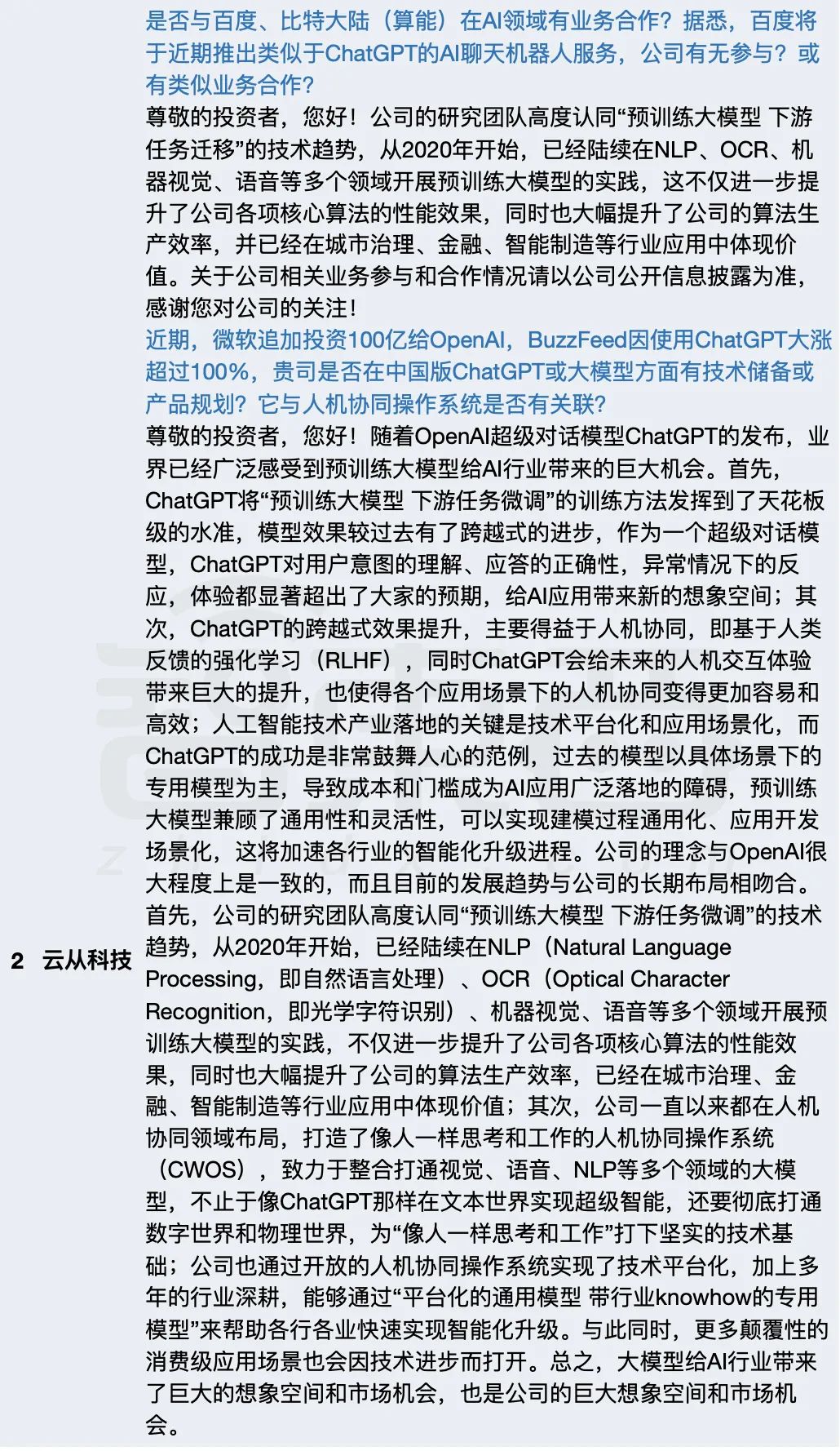 比如国内“计算机视觉四小龙”之一云从科技,早先两次回复内容有些模棱两可,都是长篇大论高度称赞ChatGPT的巨大进步,再联系到跟自家布局如何吻合。直到2月6日,云从科技发布股票交易严重异常波动公告,才打开天窗说亮话:“公司未与OpenAI开展合作,ChatGPT的产品和服务未给公司带来业务收入。”
