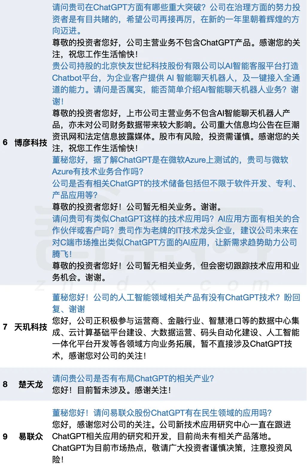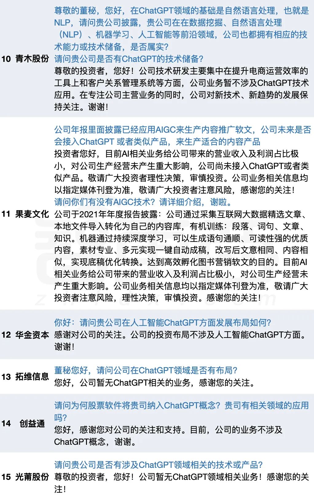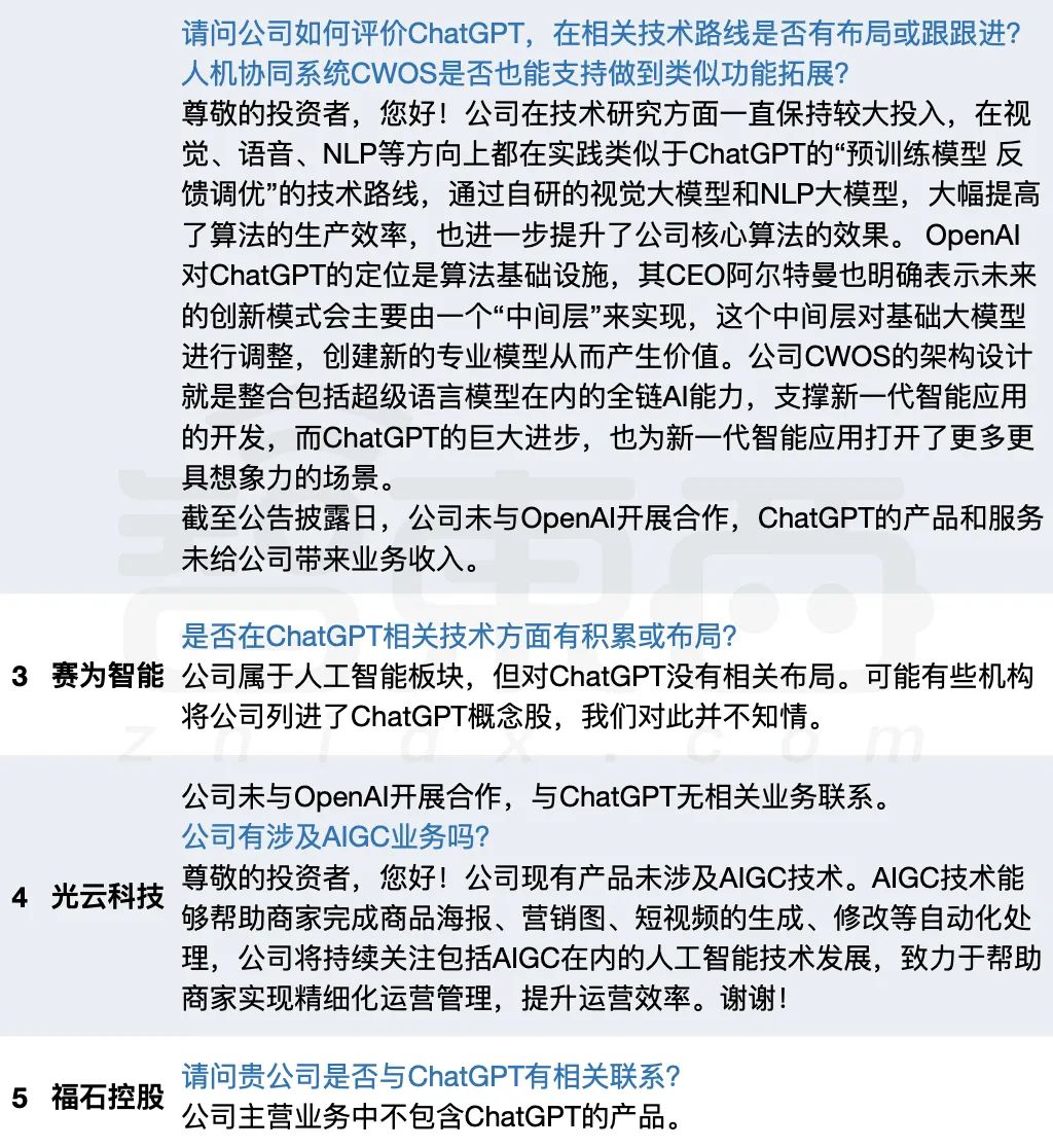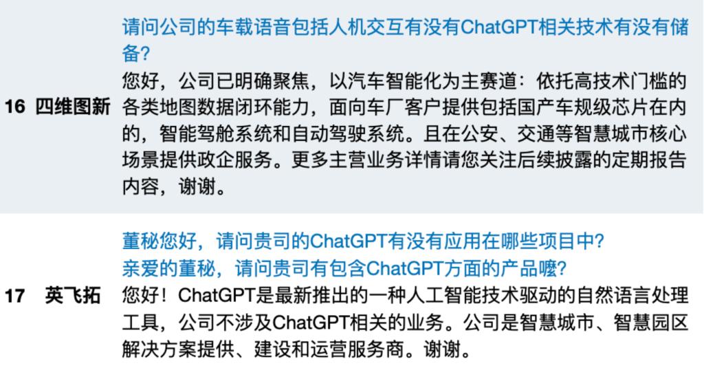 其中,大部分企业均明确回应没有涉及ChatGPT相关业务或技术应用,有些企业则在前后几次回复中显现出了态度转变。