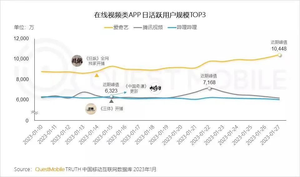 根据QuestMobile2023春节市场洞察报告显示,爱奇艺1月份日活跃用户在8000万到1亿之间,而原本与其不相上下的腾讯视频日活则基本处于在6000万左右,且陷入了与B站数据交缠的局面。