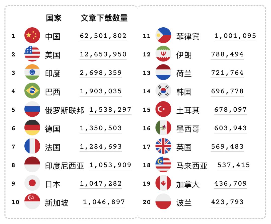 2022 年 2 月, 学术数据库 Sci-Hub 开始对外公布每月的文献下载统计——不论何时,中国用户在这个网站上的论文下载量都位居全球第一,是第二名美国的近五倍。