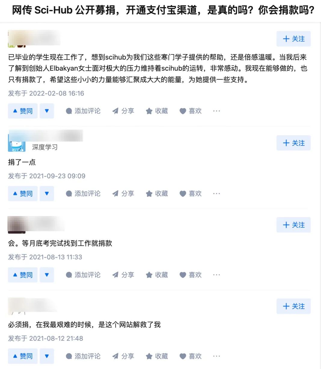 2021 年 8 月,Sci-Hub 接收捐款的账户被封,应用户要求,埃尔巴金在支付宝上开设了一个账户。立刻,大量的捐款开始涌入。至于具体收到的金额,埃尔巴金表示,支付宝的提款限制是每年三万美金,在达到限额后,她没有再积极地进行统计和收集。
