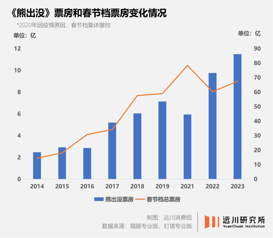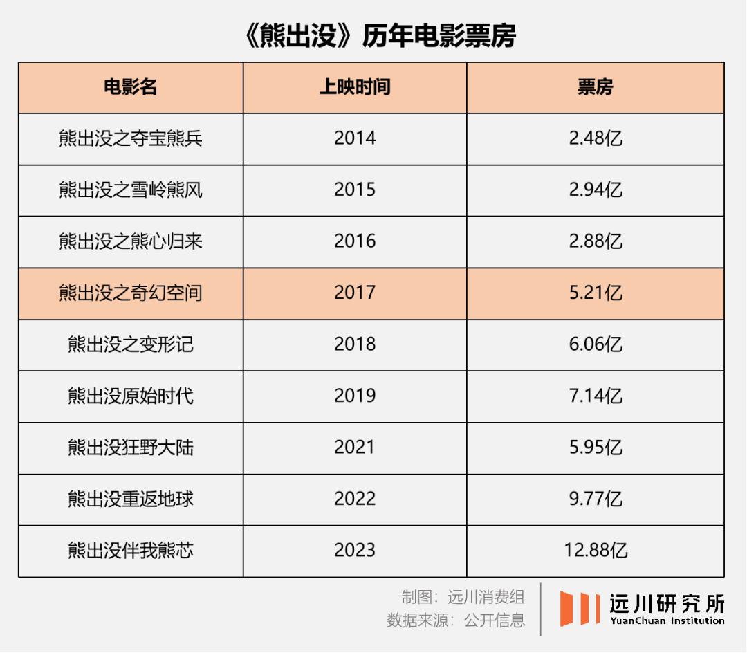 电影业一派烈火亨油的好光景,《熊出没》顺势起飞,两年间,票房就翻了一倍。