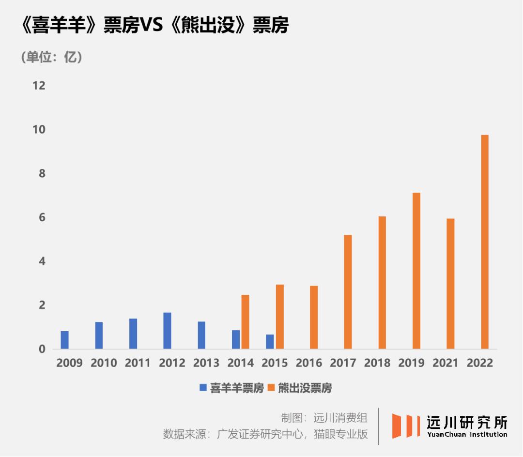 2009年-2015年,七部喜羊羊电影加起来票房还不到8亿。同为“宝宝乐”题材影片,很难说熊出没比喜羊羊精彩多少,票房如此悬殊,原因在于熊出没的“生逢其时”。