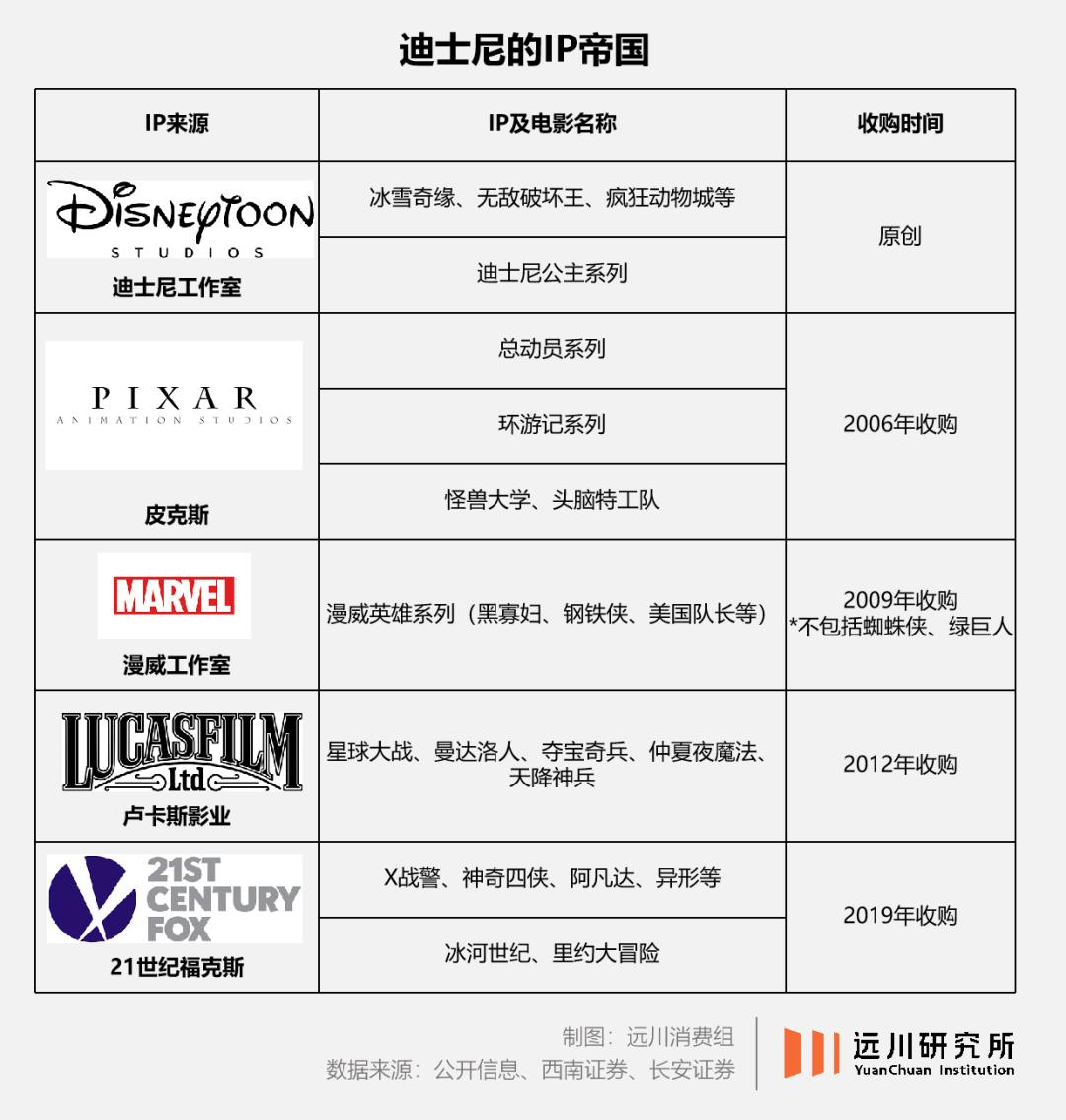 迪士尼构建如今的竞争力,靠的是庞大的IP帝国。手握米老鼠和公主的迪士尼,在2006年豪掷74亿美元买下皮克斯,三年后用42亿美元买下漫威,此后又把卢卡斯、21世纪福克斯收入囊中,喜提“收购狂魔”的称号。