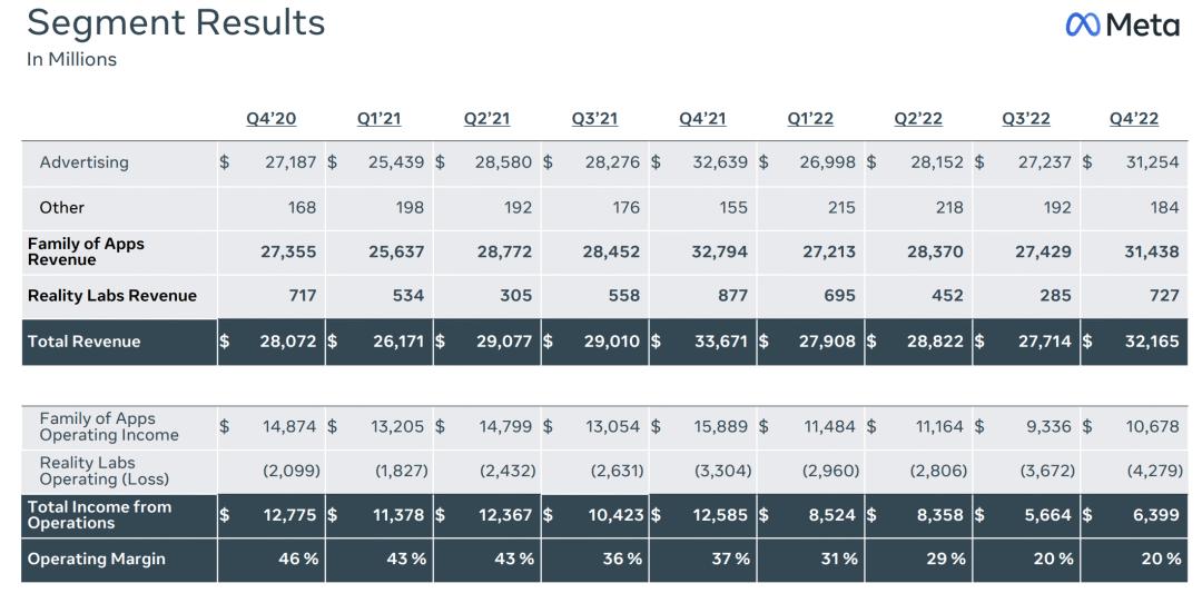 受现实实验室事业部的亏损拖累,Meta的2022年营收较2021年降低1%,为1166亿美元,作为对比,2021年对比2020年的营收增长高达37%。当然,Meta的营收下降不能完全归咎于现实实验室事业部,Tik Tok的冲击、苹果广告政策的修订都有着不小的影响。