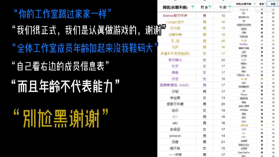 尽管「默不作声」在视频中多次强调工作室“很正式,是认真做游戏的”、“年龄不代表能力”,但仅凭一张Excel表格,显然没有多少说服力。更何况在这200人当中,还掺杂了许多试图劝导他们放弃的游戏从业者、以及单纯看热闹的互联网乐子人,成分本身就混乱且复杂。