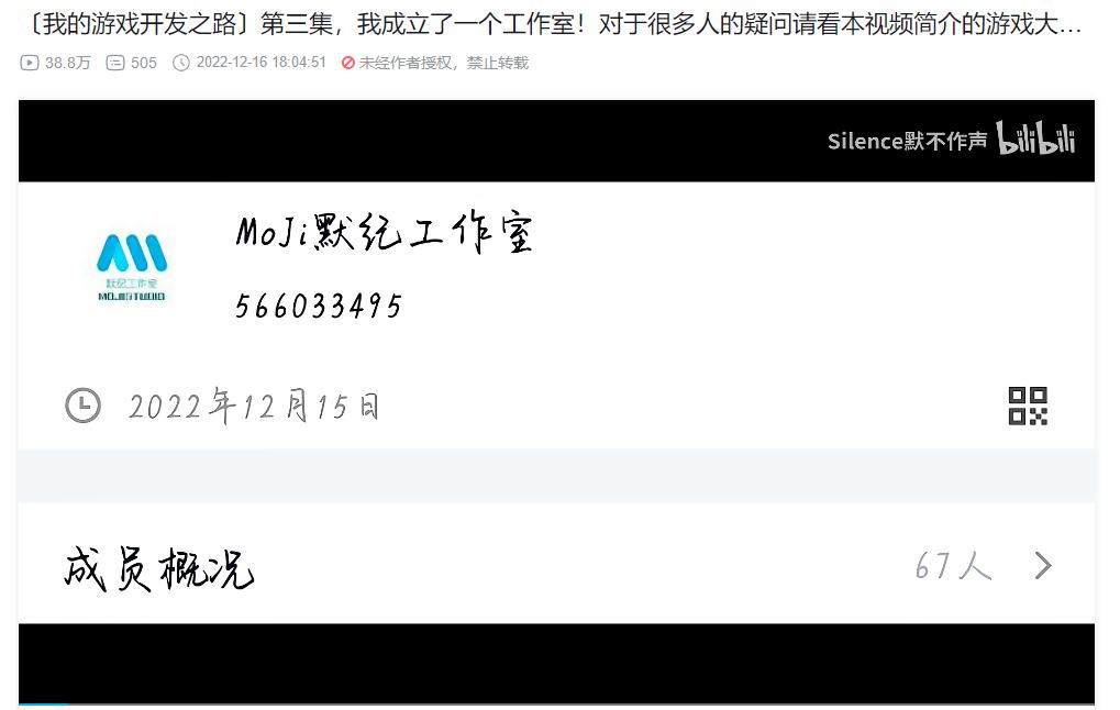 12月16日,也就是第一期视频发布后的第三天,「默不作声」宣布自己正式成立了一个开发工作室——“MoJi Studio”。成员多达200人以上,并依次分为文案组、配音组、程序组、建模组等多个部门。