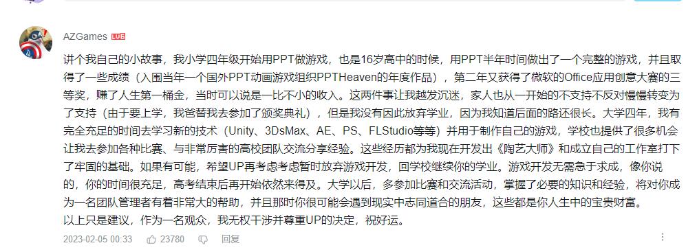 随着“辍学风波”越演越烈,许多游戏行业从业者也分享了自己的故事。16岁,有人已经用PPT游戏赚取了第一桶金,但并没有就此放弃学业,而是在考上大学后利用时间与资源积累基础,最终开发出《陶艺大师》,成立自己的工作室AZGames;有人走向创业道路,历经团队解散、大学辍学、行业遇冷后,才在游戏领域重新找到方向,做出了AVG作品《葬花》。