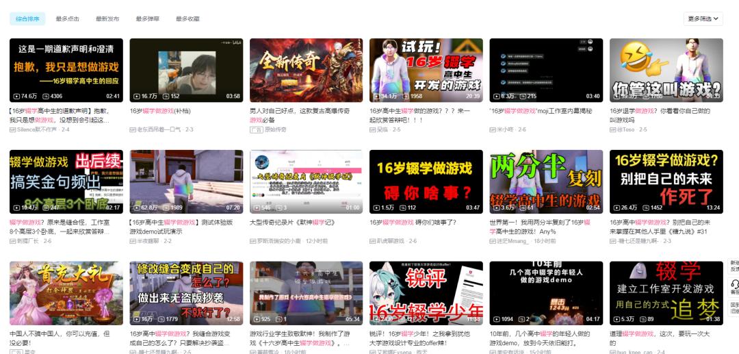 高中生、辍学、独立游戏……这些流量密码相叠加,让视频在B站迅速发酵,播放量超过150万之多。随后,“16岁高中生辍学做游戏”登上了热搜榜首,大量模仿、批判、乃至反批判的声音也相继出现。