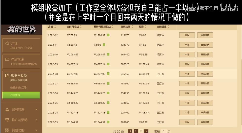按照视频中的说法,「默不作声」在初中时期就已经开始制作《我的世界》模组,并曾经在公开发布后取得过数千元的月收入,“不靠父母也能养活自己”。辍学事件之前,他在账号页面留下的简介是「网易slatt工作室开发者」,以及「UnSilenced游戏开发者」。