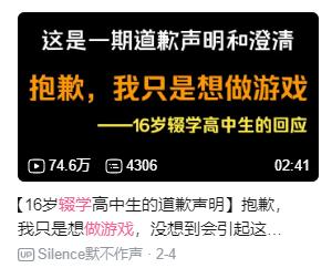 也许是舆论反响超出预期,「默不作声」很快又发布了一段道歉视频,表明自己无意引导他人,“只是想做游戏,仅此而已”。