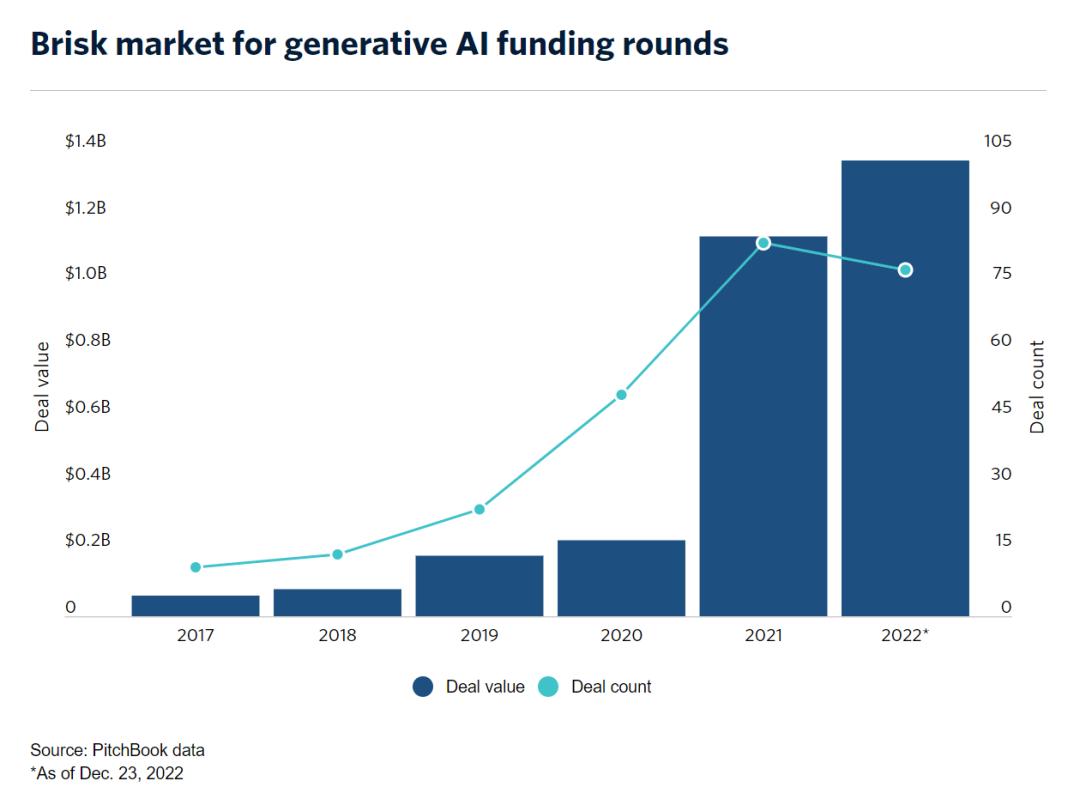 PitchBook的一项统计数据显示,2022年投资圈向生成式AI公司共投入13.7亿美元(折合人民币约93.69亿元),几乎达到了过去5年的总和。这些投资中不仅包括OpenAI、Stability AI这样的头部企业,也包如Jasper、Regie.ai、Replika等初创企业。