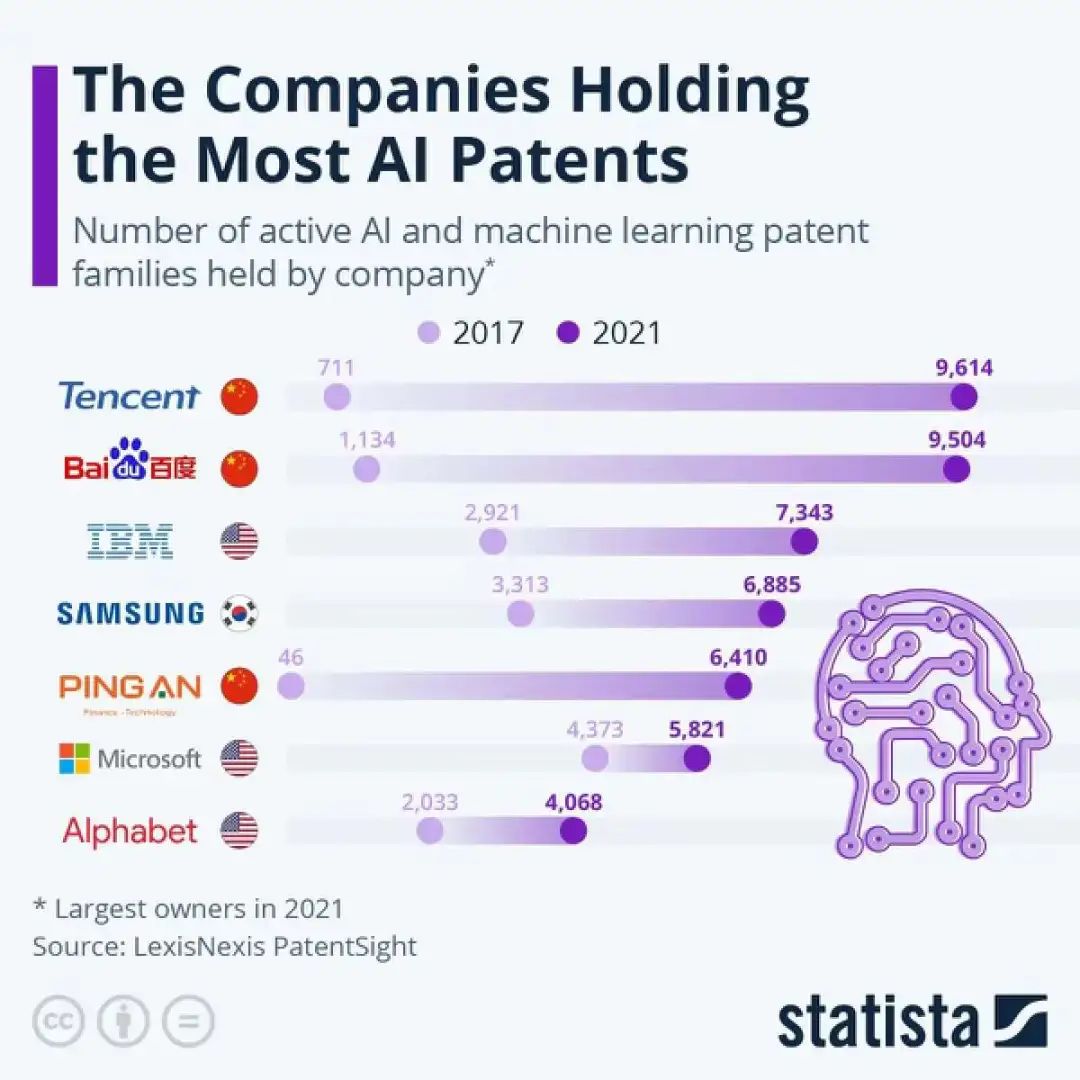 除此之外,像在专利储备上,根据statista2021年的数据,百度和腾讯都名列世界前列。