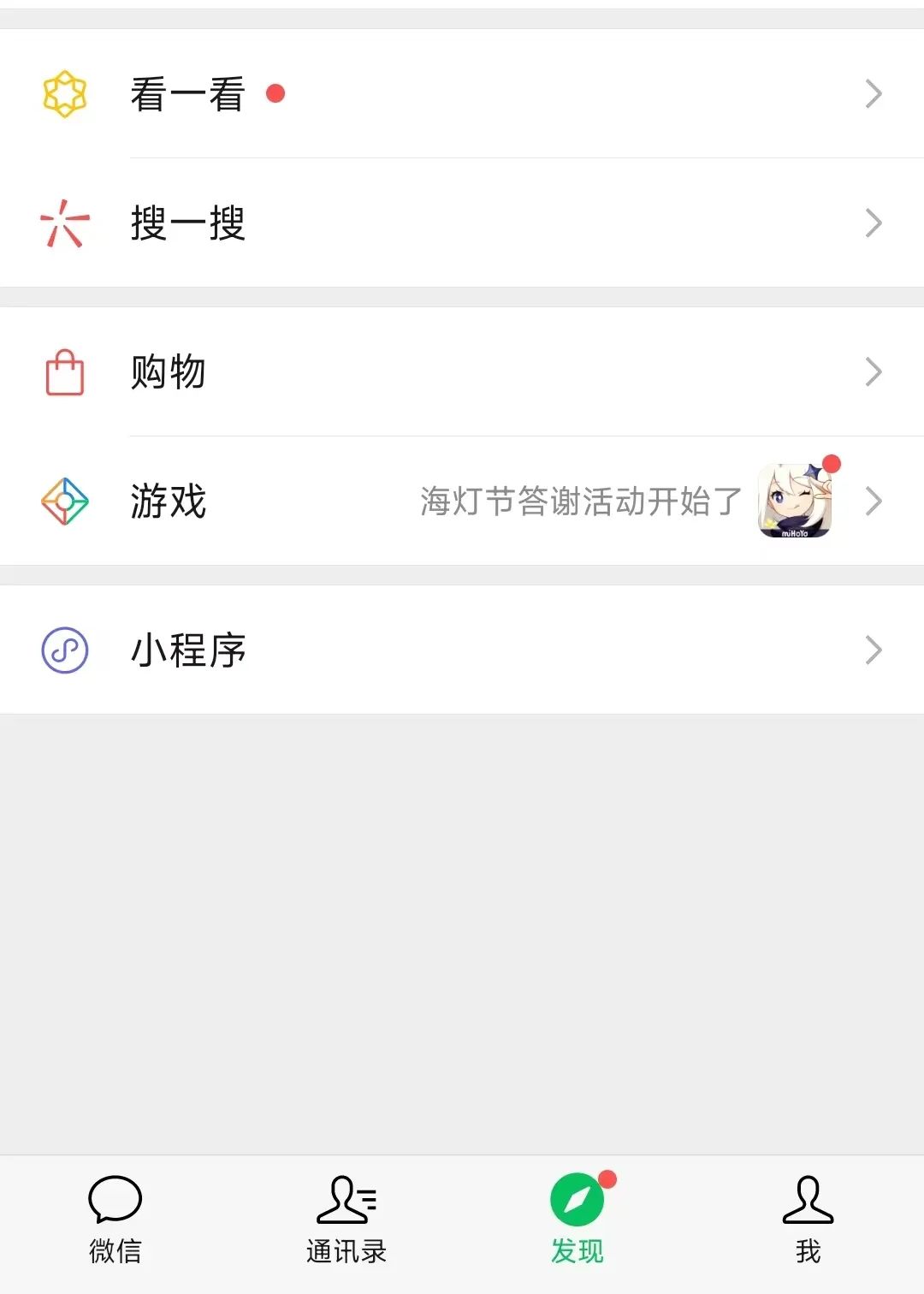 活久见,《原神》悄咪咪进入微信游戏,最近开始推活动,在微信发现页面里出现了红点提示了。