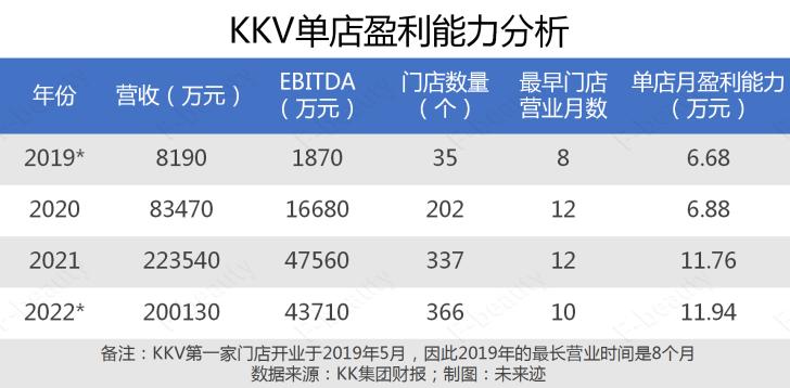 除了THE COLORIST(调色师),从财务数据上看,KKV的单店盈利能力则要更强。《未来迹Future Beauty》根据KK集团的财务报表计算发现,其单店月均EBITDA居于6万元到11万元之间,和同类型门店名创优品相比要高出不少。
