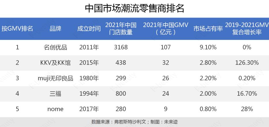 根据弗若斯特沙利文提供的数据,名创优品是2021年中国市场占有率最高的潮流零售商,市场占有率为9.1%;KK集团旗下KKV和KK馆综合起来排名第二。