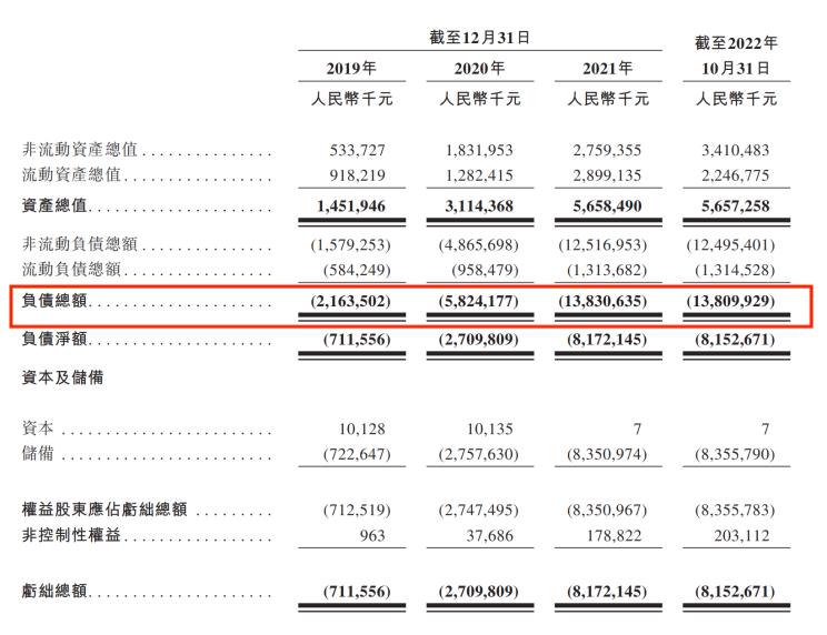 其中,争议最大的几个数据在于:KK集团发布的招股说明书显示,截止2022年10月31日,集团的负债总额居然达到了惊人的138亿元。而财报数据还显示,从2019年开始到2022年10月31日,KK集团的累计总营收只有87亿元。