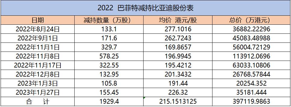 实际上,从去年8月首次开始减持,截至1月27日,巴菲特累计减持比亚迪H股8338.24万股。若不考虑分红等因素,按上述8次减持均价的平均值215.15港元/股计算,巴菲特累计减持比亚迪H股套现约179.4亿港元。按最初的投入2.3亿美元来算,已经有了近10倍的收益。