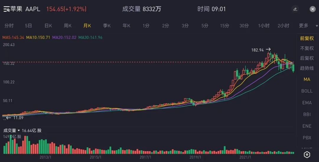 巴菲特入股苹果的时间是2016年,从2016到2018年,巴菲特买入苹果总共投入360亿美元,截至目前,加上分红和变现,巴菲特在苹果上至少赚了1000亿美元。虽然苹果在一步步走向平庸,不过苹果的股价自2011年以来,最高翻了接近20倍。